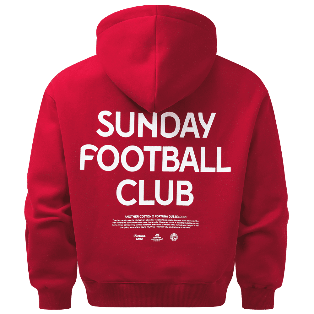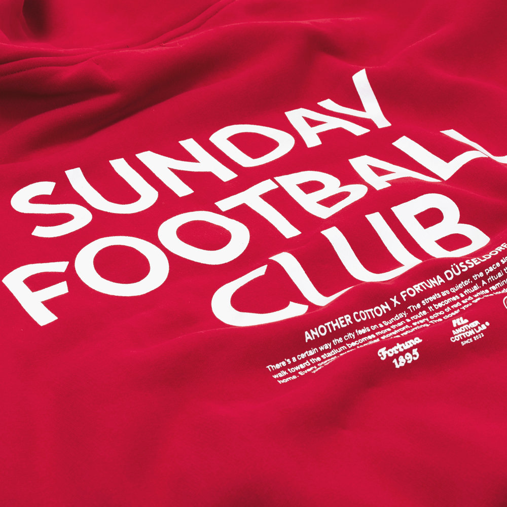 Mit unserem Hoodie "Sunday Football Club" launchen wir gemeinsam mit der Streetwear-Brand Another Cotton Lab eine gemeinsame Kollektion. Der bordeauxrote Hoodie trägt die Logos der beiden Collab-Partner auf der Brust. Den Rücken ziert der Schriftzug "Sunday Football Club" in Fortuna Sans - angelehnt an die Kollektionen von ACL. Darunter wird in klein beschrieben, wie sich das Gefühl eines Sonntagsspieltags anfühlt.