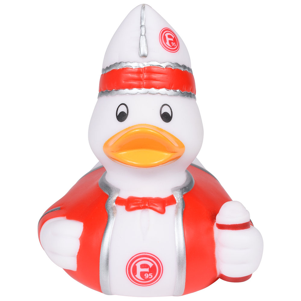 Mit unserer Badeente "Karneval" läutest Du optimal die Karnevalszeit ein. Die Ente ist in der traditionellen Karnevalsuniform gestaltet, trägt ein Krätzchen im Stil unserer Fortuna und hält ein Altbier in der Hand. Auch auf dem weißen Hemd ist ein F95-Logo abgebildet.