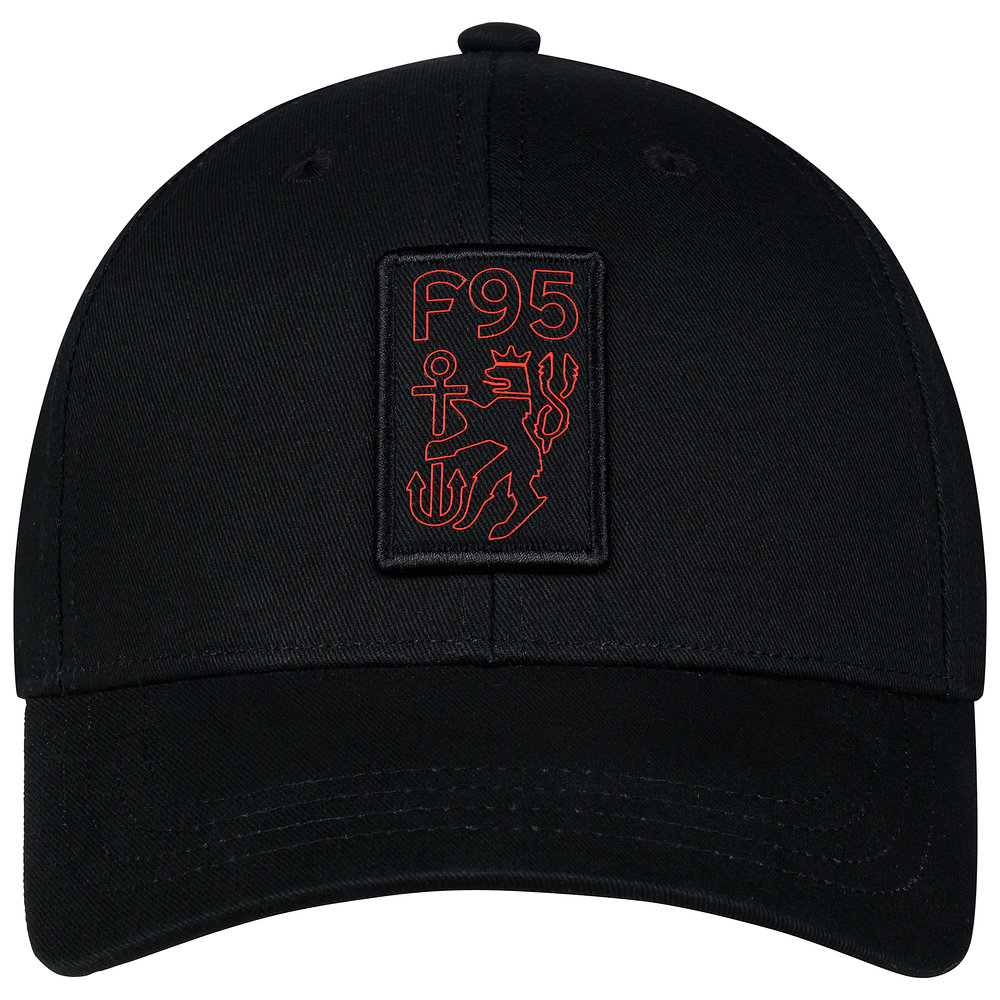Die Baseballcap "Zollstraße" besticht durch ihren coolen Kontrast der zarten roten Details auf der schwarzen Grundfarbe der Cap. So ist auf der Vorderseite ein Patch eingestickt, der mit dünnen, roten Linien den Schriftzug "F95" sowie den Düsseldorfer Löwen mit Anker aus dem Stadtwappen präsentiert. Dadurch kannst Du dezent Deine Liebe zur Stadt Düsseldorf und zur Fortuna ausdrücken.