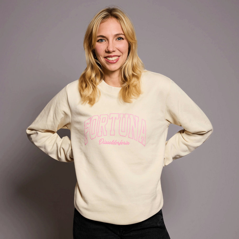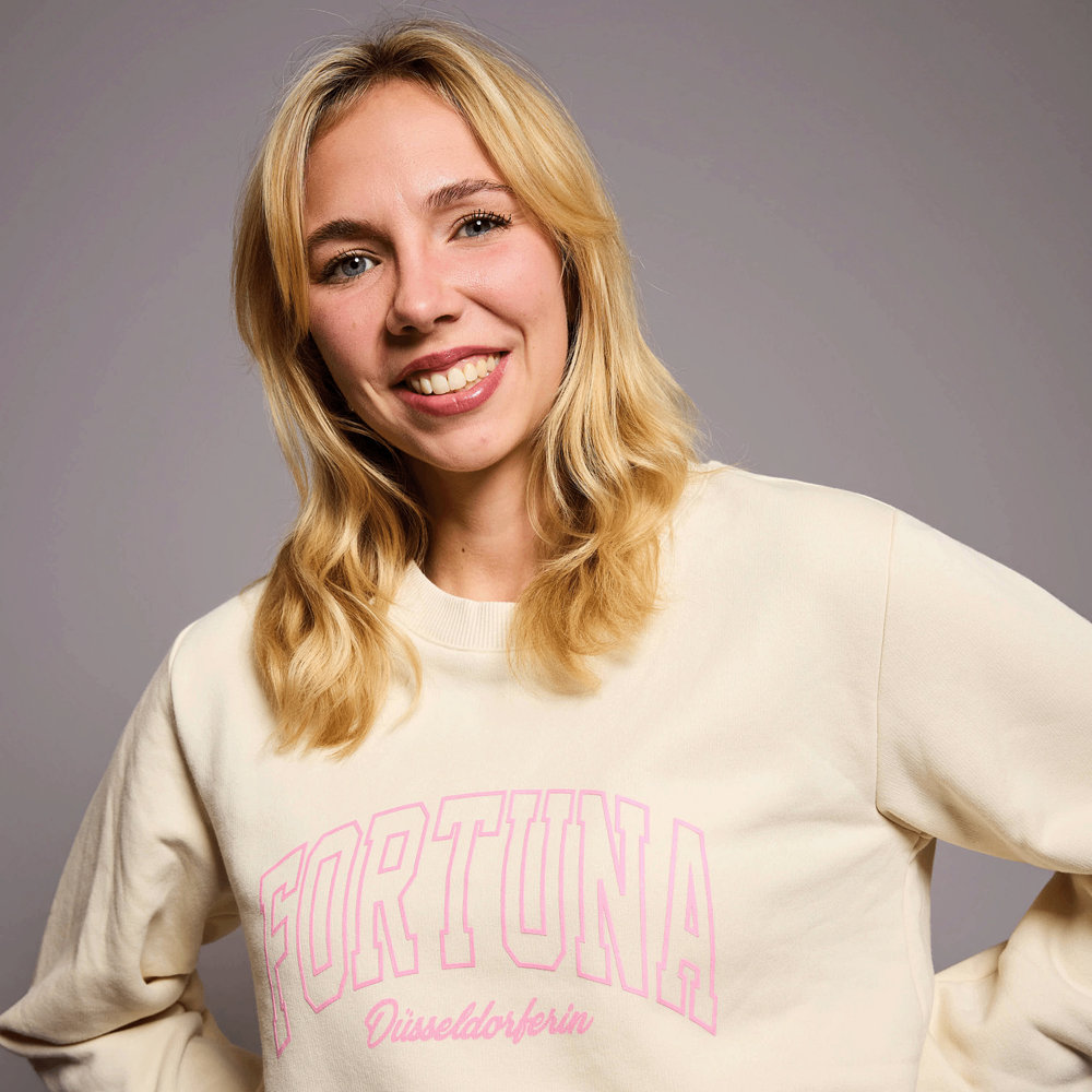 Der Fortuna Damenpullover "Unterrath" bringt deinen Vereinsstolz modisch auf den Punkt. In edlem Off-White gehalten und mit einem zartrosafarbenen "Fortuna"-Schriftzug auf der Vorderseite versehen, trifft unser Pullover genau den Geschmack stilbewusster Fortunen. Darunter setzt der geschwungene Zusatz "Düsseldorferin" einen zusätzlichen Akzent und zeigt, dass unser Verein dein Herz erobert hat. Ein Sweater, der subtil und dennoch klar zeigt: Fortuna und F95 gehören einfach zu dir dazu.
