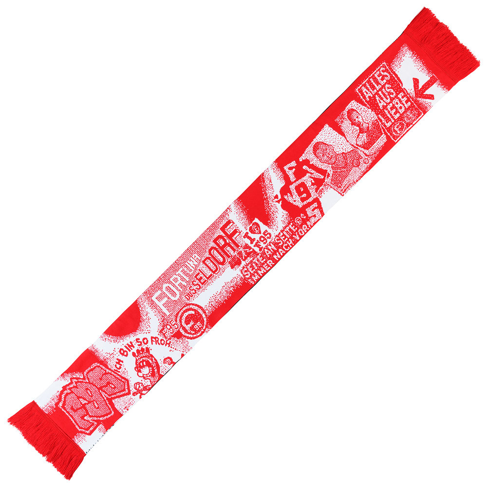 Eure Favoriten sind da! Mit dem Deluxeschal "Arena" präsentieren wir einen der drei Gewinnerschals der Abstimmung aus dem Frühjahr 2025. Entworfen wurden die Schals im Rahmen eines Projekts in Kooperation mit Studierenden der FH Dortmund. Der Schal präsentiert auf der rot-weißen Vorderseite einige Banner, Doppelhalter und Graffitis, die an Spieltagen in der Arena zu finden bzw. daran angelehnt sind. Die Rückseite ist in schwarz und weiß gehalten und zeigt die Dachkonstruktion der Arena inklusive des "F95"-Schriftzugs an den Schalenden.