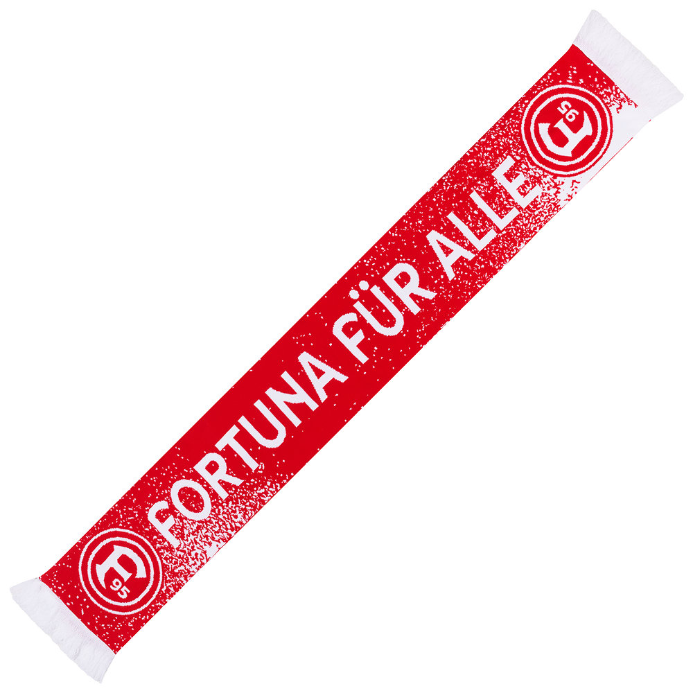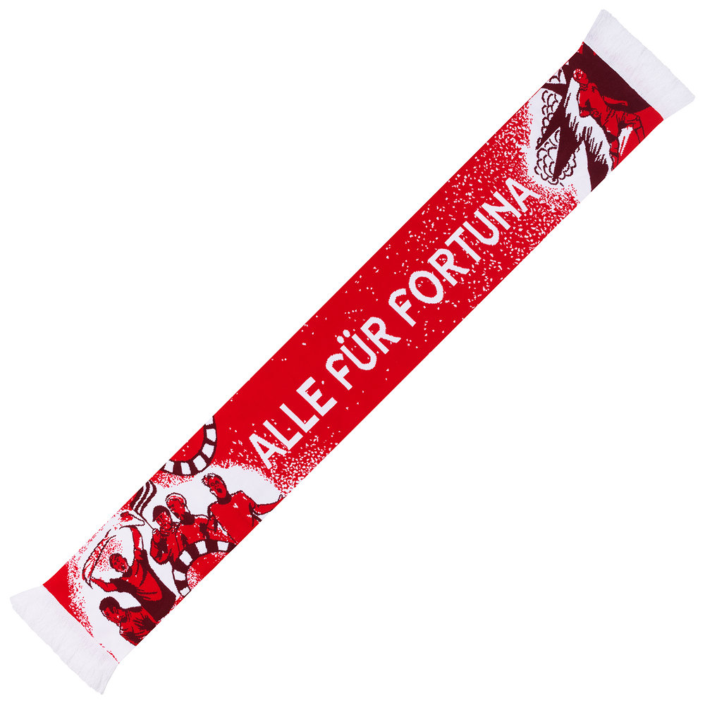 Mit unserem Fortuna Deluxeschal "Fortuna für alle" drücken wir die Zusammengehörigkeit aus, die in unserem Verein gelebt wird. Der rote Schal präsentiert in weiß die Schriftzüge "Fortuna für alle" und "alle für Fortuna" auf Vorder- sowie Rückseite. Die Schalenden werden durch F95-Logos und weiße Sprenkel verziert. Das Highlight sind jedoch die detailreichen Zeichnungen von jubelnden Fans sowie einem Spieler auf dem Platz.