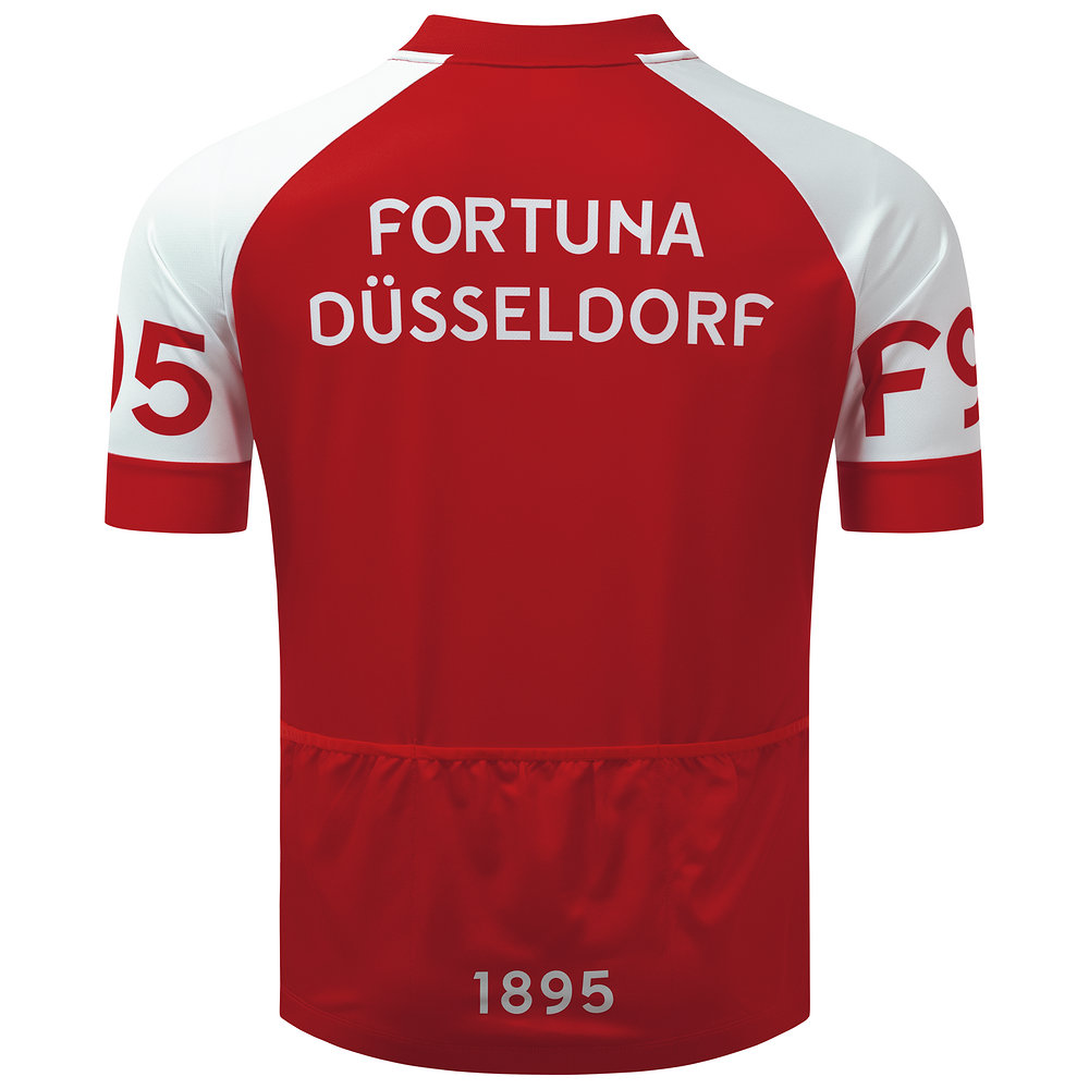 Mit unserem Fahrradtrikot "Skyline" lassen sich selbst die herausforderndsten und anstrengendsten Strecken mit Freude bewältigen, da Du immer Deinen Herzensklub aus Flingern repräsentieren kannst. Das Trikot verbindet dabei sportliche Performance mit einem schönen Fortuna-Design. In Rot und Weiß gehalten setzt sich die Düsseldorfer Skyline vom Hintergrund ab. Die Ärmel zeigen den Schriftzug "F95", während unser Logo auf der linken Brust prangt. Auf der Rückseite runden "Fortuna Düsseldorf" und eine "1895" das Design ab. Ob eine kurze Runde durch die Stadt oder eine längere Ausfahrt ins Umland - unser Fahrradtrikot begleitet Dich auf jeder Tour.