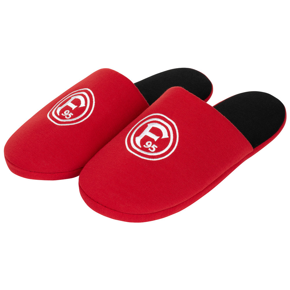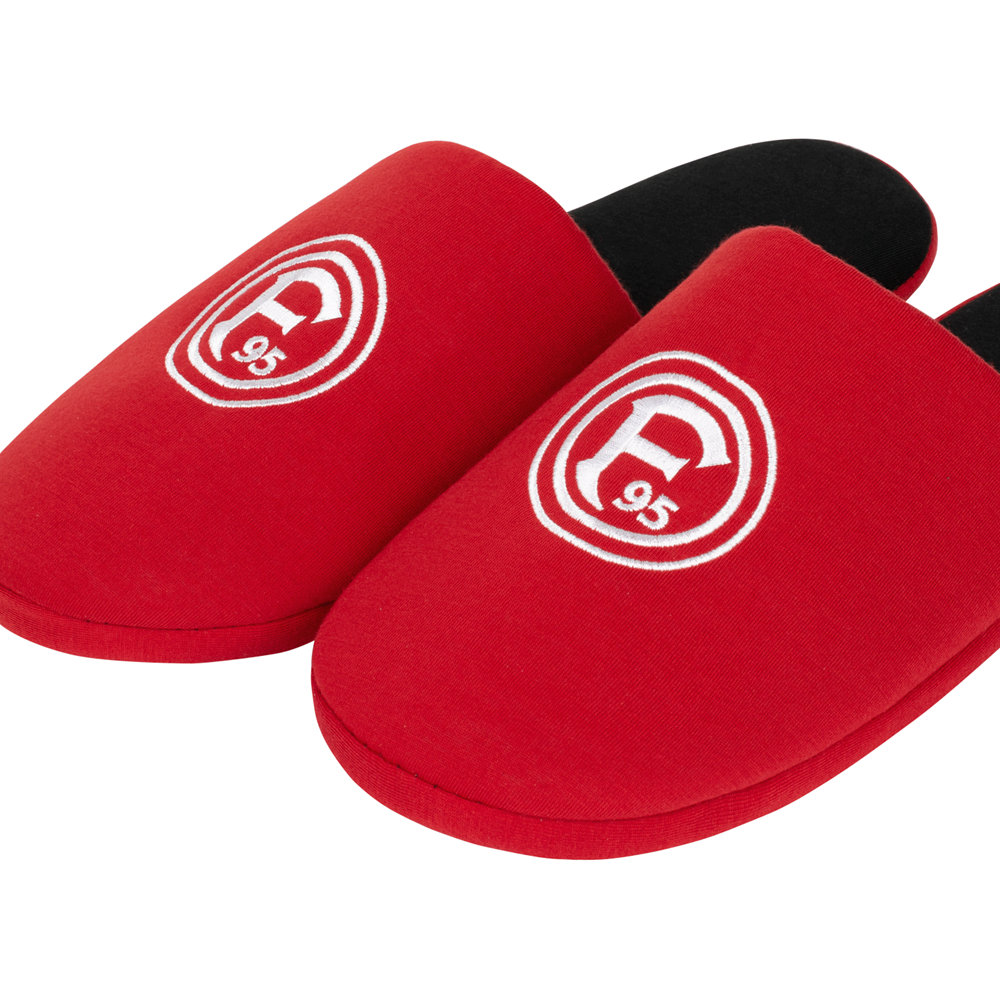 Die Hausschuhe "Logo" gestalten das alltägliche Leben in Deinen vier Wänden etwas gemütlicher und bieten optimalen Tragekomfort. Die Schuhe sind in rot gehalten und präsentieren unser F95-Logo auf der Vorderseite. Die Innenseite ist ganz in schwarz gehalten.