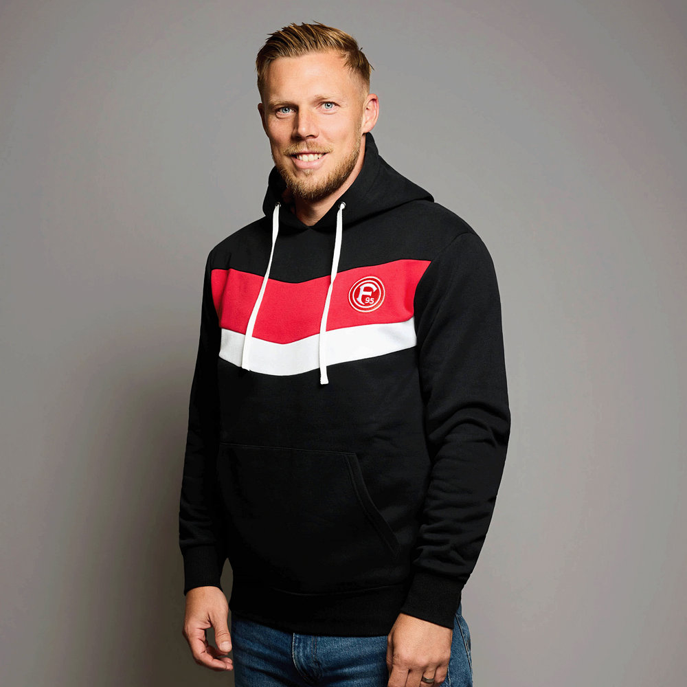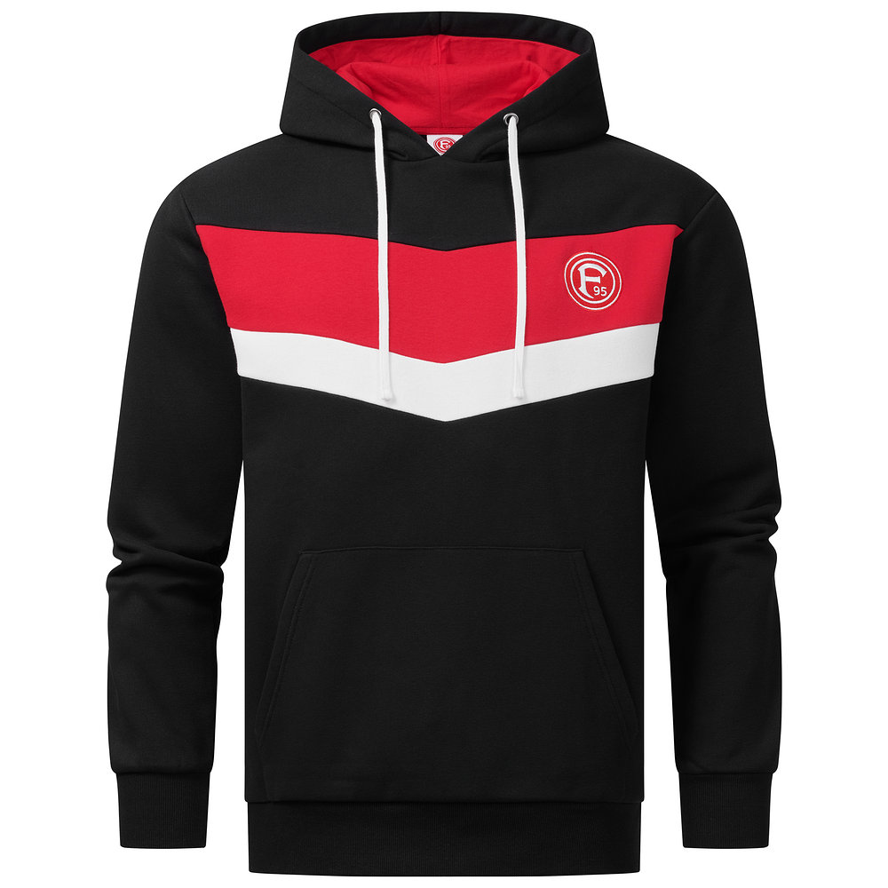 Der Fortuna Hoodie "Nordpark" ziert ein simples, aber dennoch sehr ansprechendes Design. Den schwarzen Hoodie überzieht ein Blockstreifen-Muster in rot und weiß, das sich pfeilförmig angeordnet im Brustbereich befindet. Zudem ist unser F95-Logo auf der linken Brust zu sehen. Daneben ergänzen die weißen Kordeln den Stil.