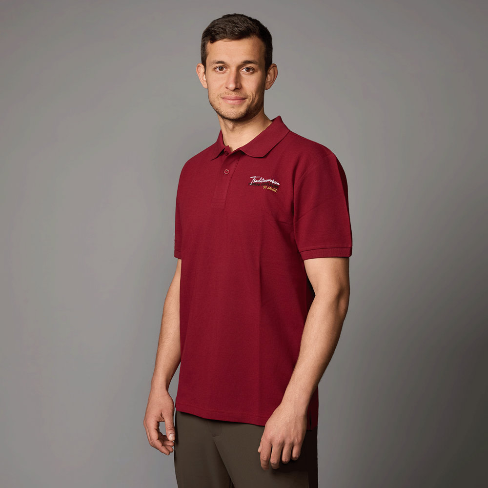 Mit dem Fortuna Polo "Traditionsverein" aus der gleichnamigen Kollektion zu unserem 130-jährigen Jubiläum möchten wir gemeinsam mit euch unsere traditionsreiche Geschichte feiern. Das bordeauxrote Polo zeigt auf der linken Brust die Schriftzüge "Traditionsverein", "Fortuna Düsseldorf" und "130 Jahre" in den Farben weiß, schwarz und gold. Diese sind jeweils in besonderen Schriftarten gestaltet. Auf dem Rücken sind ähnliche Schriftzüge wie auf der Vorderseite zu sehen, die jedoch von neun historischen F95-Logos begleitet werden, die Nostalgie erzeugen.