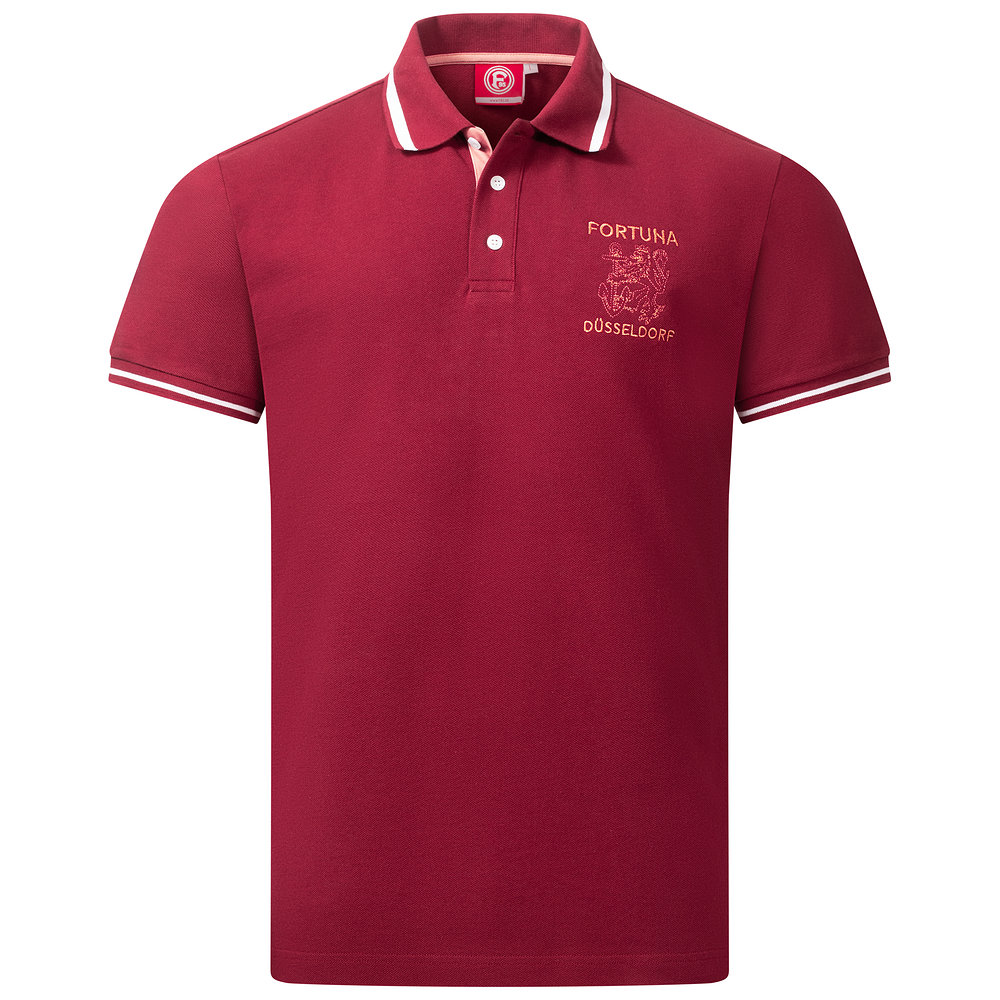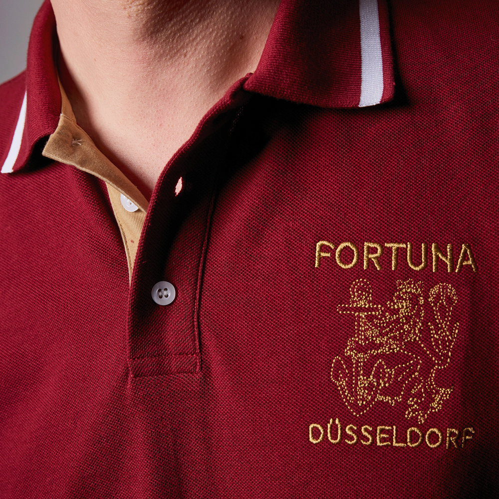 Das Fortuna Poloshirt "Morper Bachtal" überzeugt durch seine schöne Farbwahl und den edlen Piqué-Stoff, aus dem das Shirt gefertigt wurde. Das bordeauxrote Polo wird durch weiße Akzente an den Ärmeln sowie am Kragen verfeinert, wodurch seine Optik deutlich aufgewertet wird. Der Fortuna-Bezug wird durch den Stick auf der linken Brust erreicht. Der gelbe Schriftzug "Fortuna Düsseldorf" umrahmt den Löwen mit Anker des Düsseldorfer Stadtwappens. In Summe ist das Polo eine stilvolle Wahl für verschiedene Anlässe, an denen du einerseits elegant unterwegs sein und andererseits deine Liebe zu F95 ausdrücken möchtest.