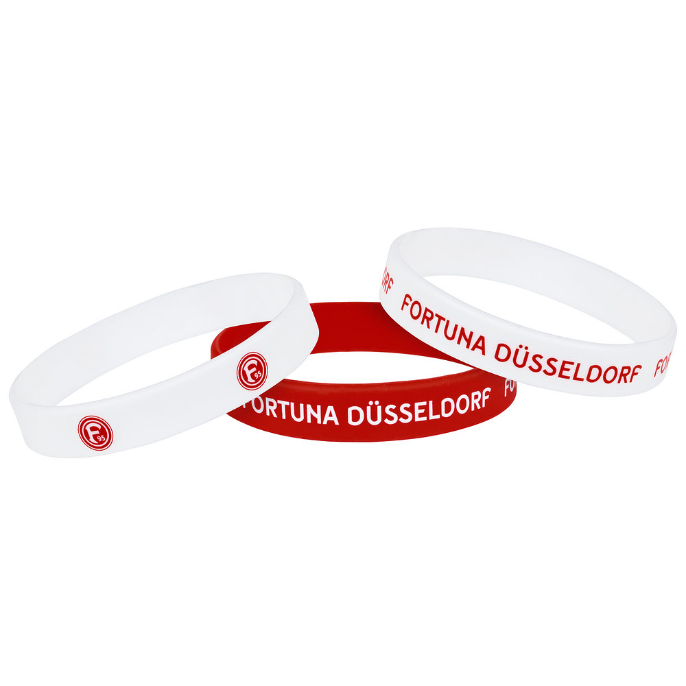 Mit unseren Silikonarmbändern im praktischen 3er-Set hast Du die Auswahl zwischen drei ansprechenden Designs, um Deine Verbundenheit zur Düsseldorfer Fortuna zu zeigen. Sie sind klassischerweise in Rot und Weiß gehalten und zeigen den Schriftzug "Fortuna Düsseldorf" sowie unser F95-Logo. Ob einzeln getragen oder kombiniert: Sie setzen ein klares Zeichen für alle Fortunen. Dank des flexiblen Silikonmaterials sitzen die Armbänder angenehm am Handgelenk und machen jede Bewegung mit.