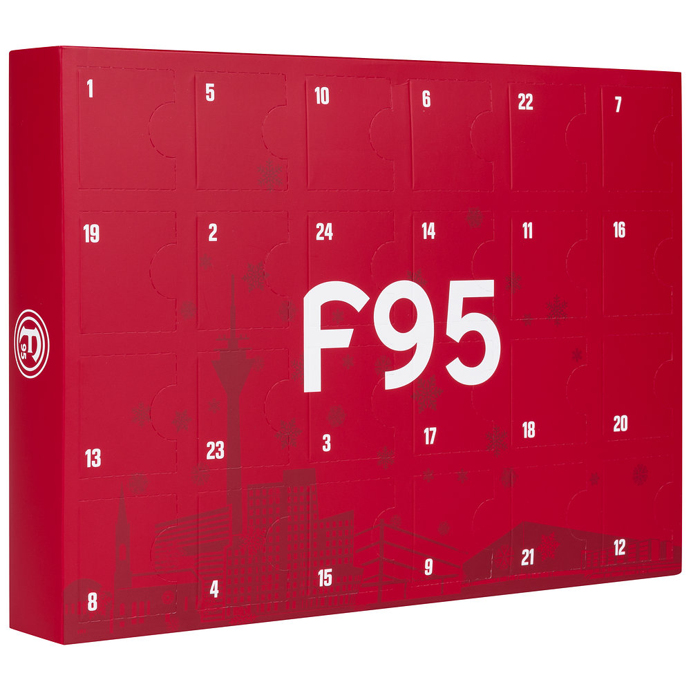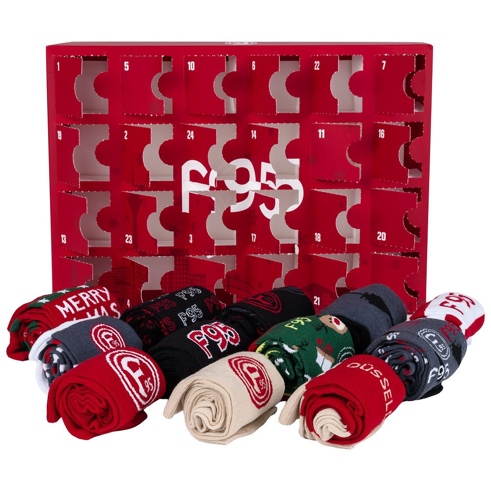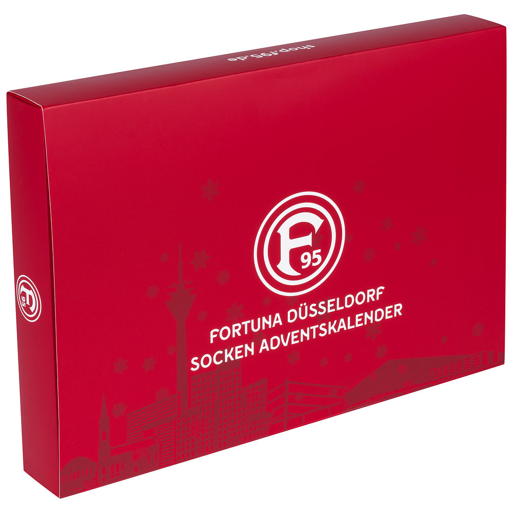 Mit unserem Socken-Adventskalender erweiterst Du Deine Auswahl an F95-Socken um 12 Paare. Jeden Tag im Dezember bekommst Du eine weitere, liebevoll designte Socke und kannst so die Tage bis Weihnachten perfekt überbrücken. Den roten Kalender ziert dabei unsere Düsseldorfer Skyline.