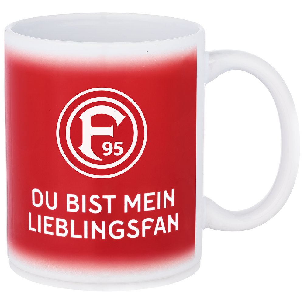 Die Fortuna Tasse "Lieblingsfan" eignet sich perfekt dafür, einer besonderen Person eine große Freude zu machen. Die rote Tasse ziert ein F95-Logo, das vom Schriftzug "Du bist mein Lieblingsfan" komplettiert wird. Die Rückseite ist mit einer Zeichnung von zwei Herzen gestaltet, die zusammen mit ihren Händen ein weiteres Herz formen. Darin ergibt sich ein kleines F95-Logo.