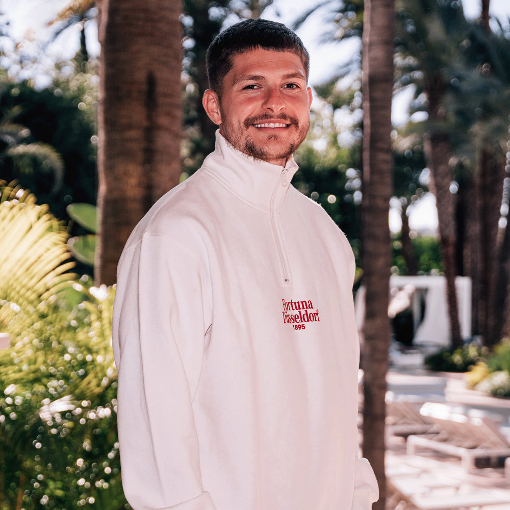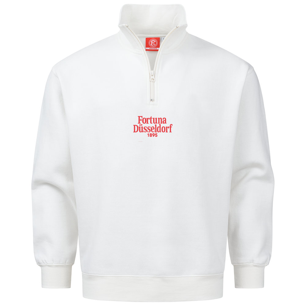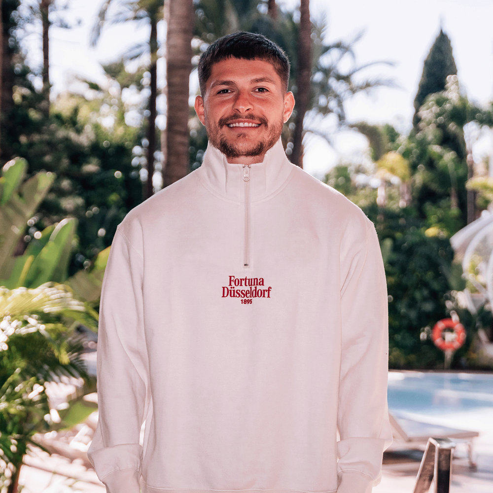 Mit unserem Half-Zip Pullover "Albertstraße" bist Du stylisch und komfortabel unterwegs. Sein schlichtes Design, bestehend aus Weiß als Grundfarbe und der roten "Fortuna Düsseldorf 1895"-Aufschrift im Brustbereich, macht ihn vielseitig kombinierbar. Dank Reißverschluss am Kragen lässt sich der Pullover flexibel öffnen oder schließen und eignet sich perfekt für jeden Spieltag.