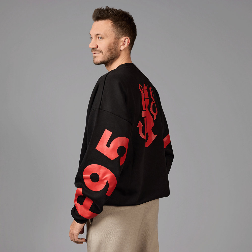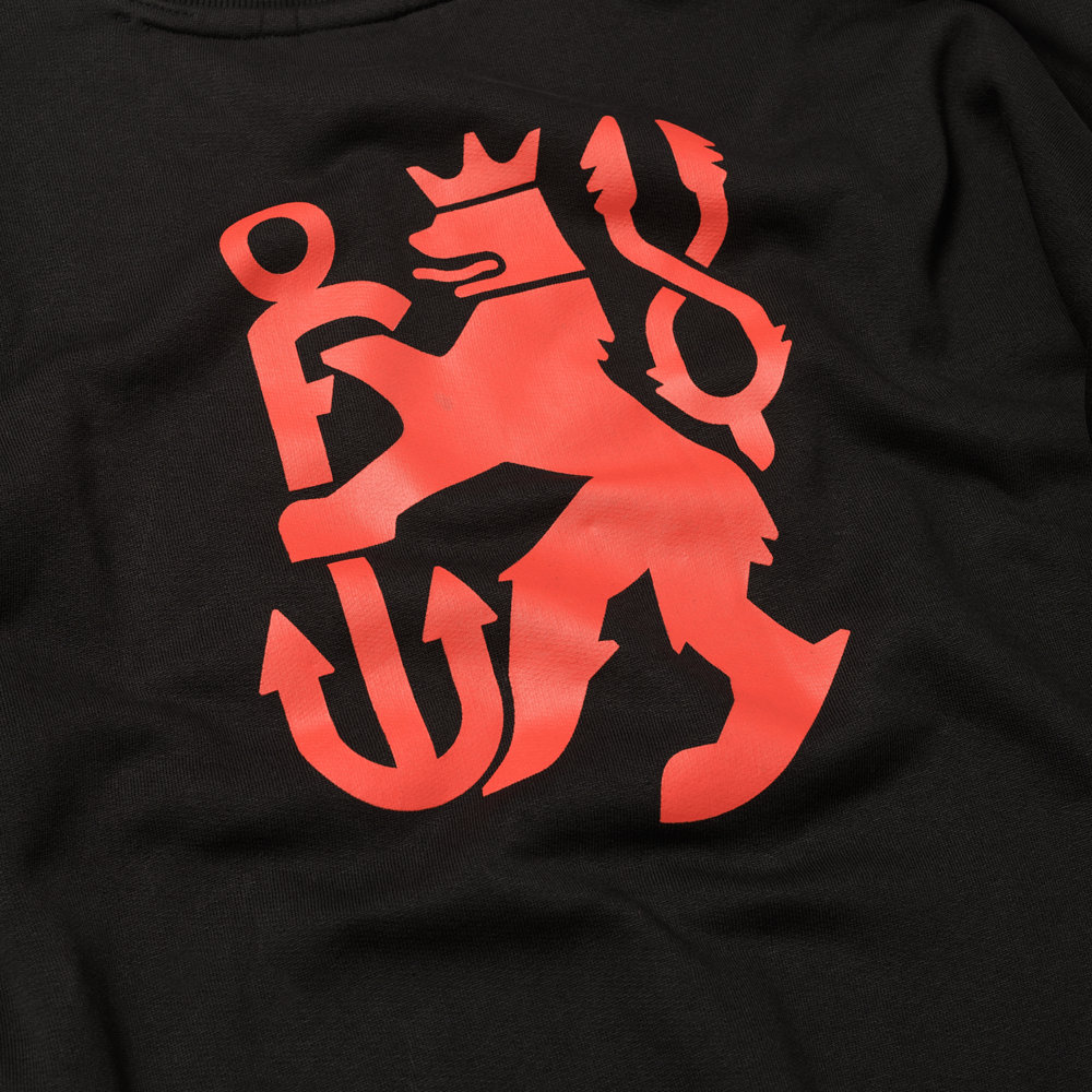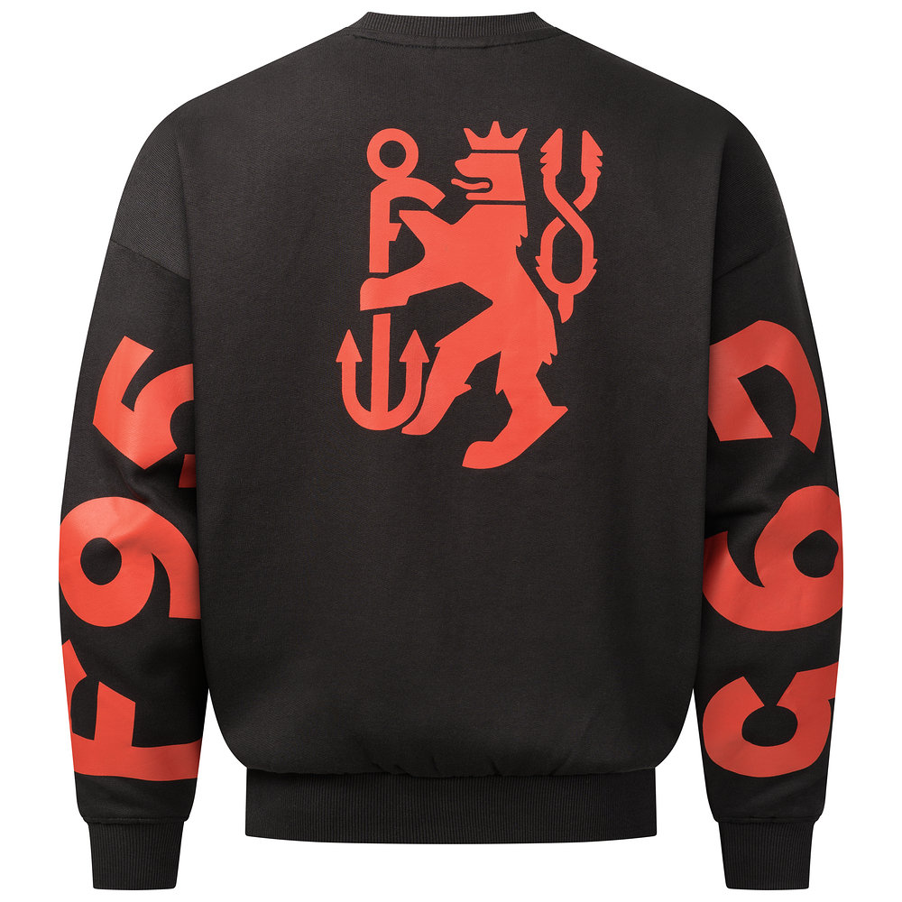 Der Pullover "Ronsdorfer Straße" verbindet Deine Liebe zur Fortuna mit einem lässigen Schnitt. Der schwarze Pullover ist speziell an den Ärmeln weit geschnitten, sodass beim Ausstrecken der Arme der große, rote "F95"-Print auf der Rückseite zu sehen ist. Zudem sorgt der große Düsseldorfer Löwe mit Anker aus dem Stadtwappen für einen Hingucker, der groß auf der Pullover-Rückseite abgebildet ist. Eine kleinere Zeichnung ist mittig auf der Vorderseite angebracht, die mit einer "F95" abgerundet wird.