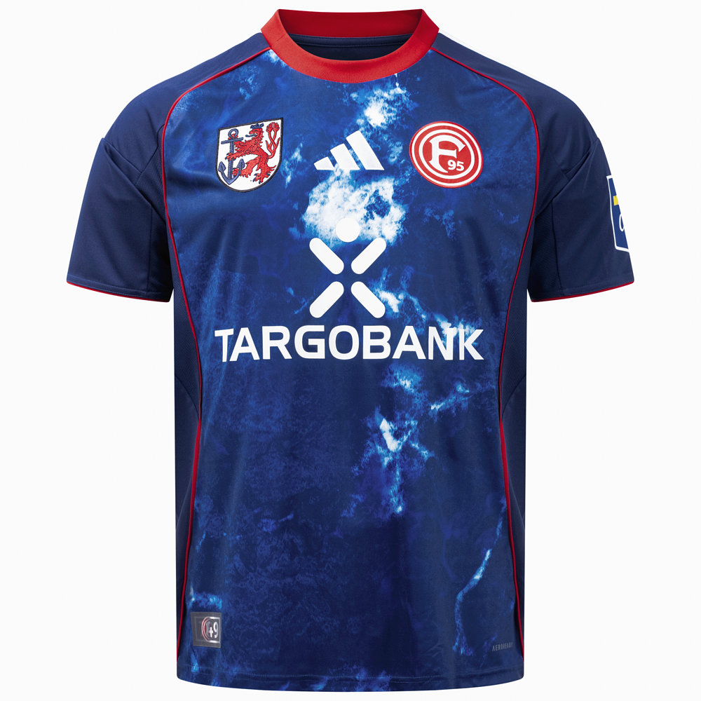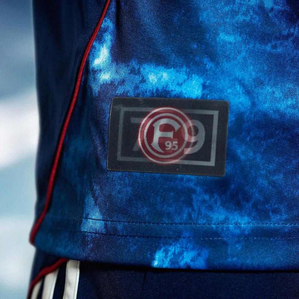 Das Sondertrikot kommt in Rot, Weiß und Blau – in Anlehnung an die Stadtfarben – daher. Auf der blauen Vorderseite werden die Strömungen des Rheins widergespiegelt. Der rote Kragen, die roten Ärmelbündchen und das dezente rote Piping setzen farbliche Highlights.Eine große Besonderheit: Auf der Brust prangt nicht nur das F95-Logo als hochwertiger Stick auf der linken Seite, sondern auch das Düsseldorfer Stadtwappen rechts. Das adidas-Logo rückt in die Mitte. Den Bund der Vorderseite ziert darüber hinaus ein Badge, welches das F95-Logo mit der Zahl 749 kombiniert. Dabei handelt es sich um den Rheinkilometer, an dem sich unsere Heimspielstätte befindet. Im Nacken befindet sich ein Silikon-Logo, das der Düsseldorfer Rathaustür nachempfunden ist. Dabei wird der Bergische Löwe mit dem Rhein und seinen Brücken in Verbindung gebracht. Die Logos der Targobank und Metro Chef passen farblich harmonisch ins Erscheinungsbild. Das AEROREADY-Material von adidas sorgt für ein trockenes und angenehmes Tragefühl.