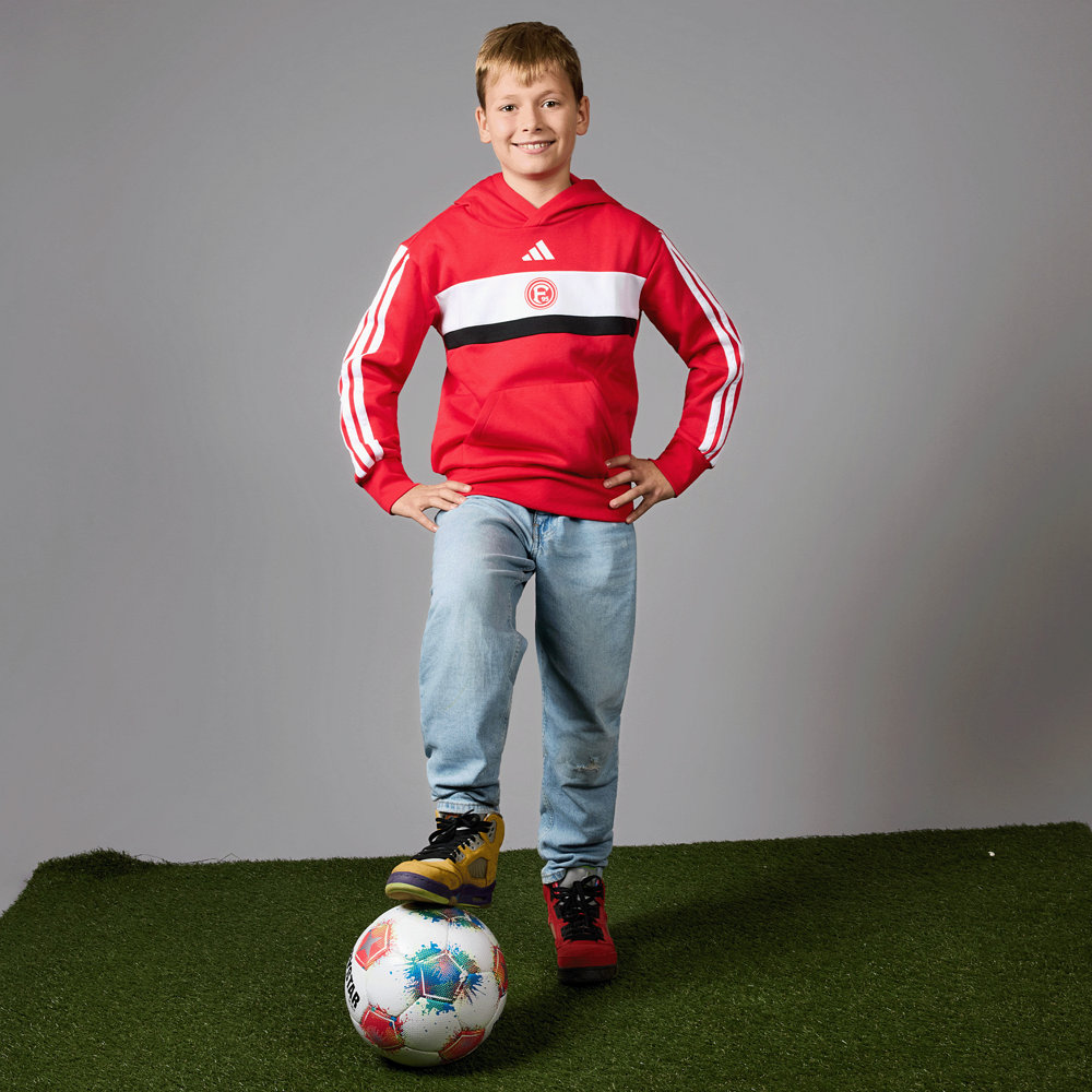 Unser adidas Hoodie "Merlinweg" ist der ideale Alltagsbegleiter, denn er verleiht nicht nur einen stylischen Look und ist bequem sondern hält Dich zudem an kühleren Tagen warm. Mit einer Kapuze und einer Kängurutasche versehen, zeichnet er sich durch seinen kräftigen Rotton aus. An den Ärmeln befinden sich die klassischen adidas-Streifen und das adidas-Logo ist unterhalb des Kragens abgebildet. Darunter befinden sich zwei unterschiedlich breite Streifen in Weiß und Schwarz, wovon der weiße Streifen durch das F95-Logo geschmückt wird.