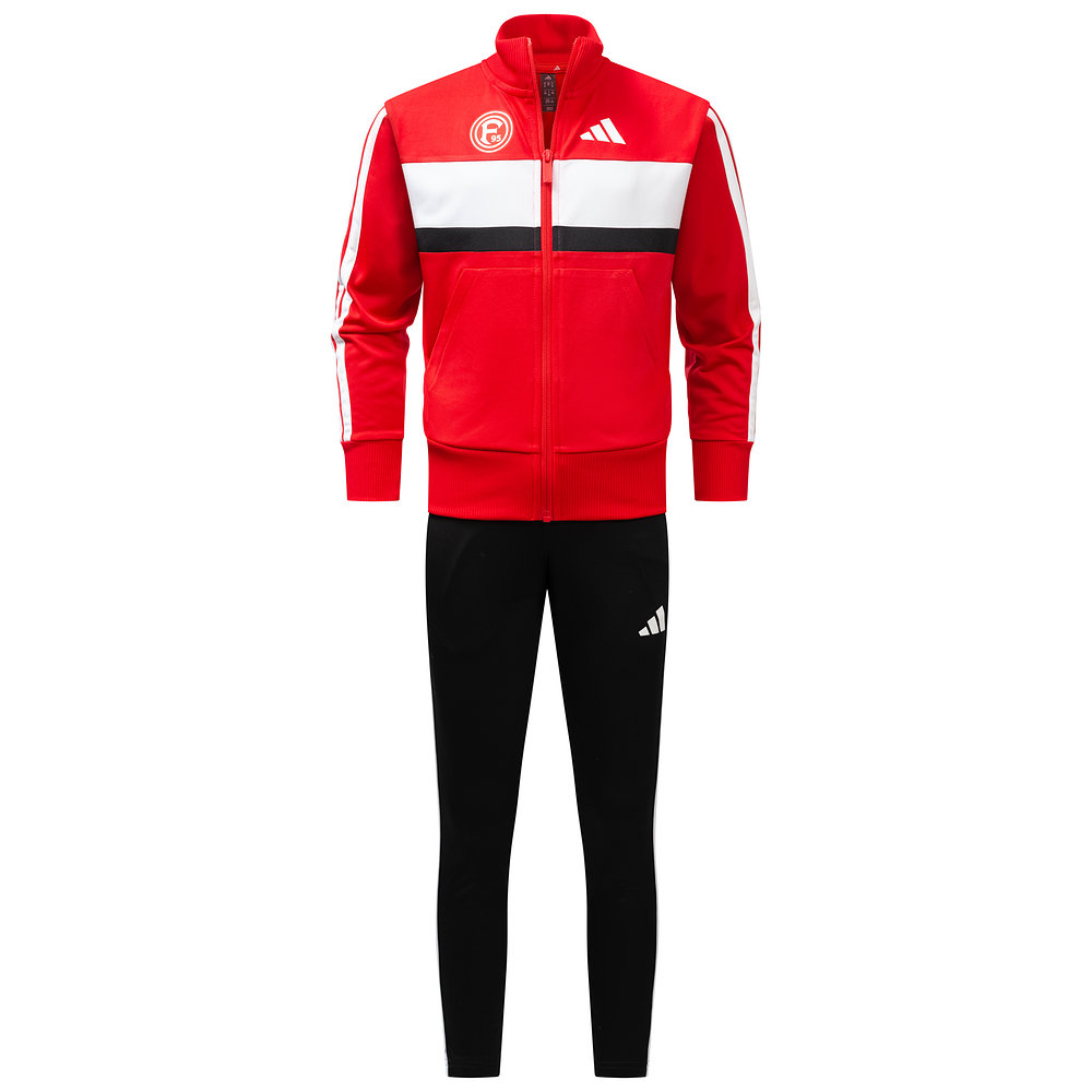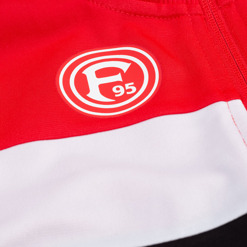 Unser adidas Jogginganzug "Merlinweg" ist bequem und wird mit seinem sportlichen Look zu einem echten Hingucker für junge Fans von Fortuna Düsseldorf. Er besteht aus einer schlichten schwarzen Jogginghose und einer rotfarbenen Jacke mit Taschen. Auf der Jacke befinden sich im Brustbereich schwarze und weiße Elemente, an den Ärmeln die klassischen adidas-Streifen. Das adidas-Logo ist links unterhalb des Kragens und am linken Hosenbein der Jogginghose abgebildet. Rechts unterhalb des Kragens ist das F95-Logo platziert, das Deine Liebe zum Verein präsentiert.